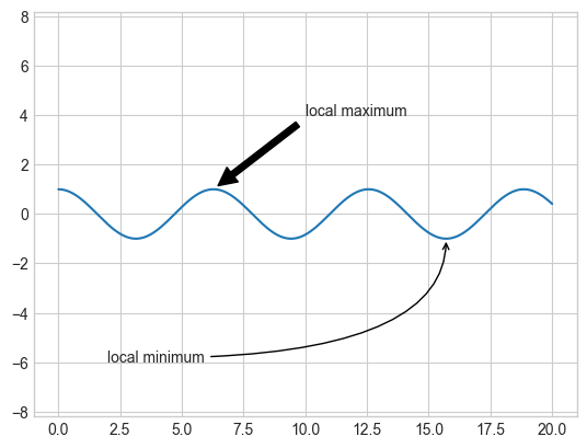 ax.annotate('local minimum', xy=(5 * np.pi, -1), xytext=(2, -6),