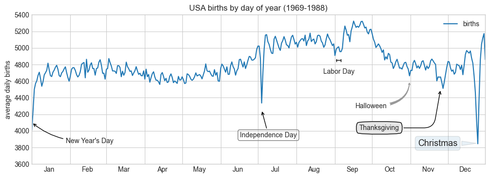 ax.text('2012-1-1', 3950, "New Year's Day", **style)