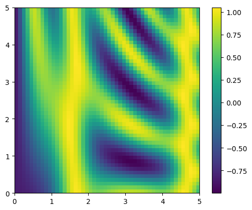 # x와 y는 0에서 5까지 50단계로 나눈 배열